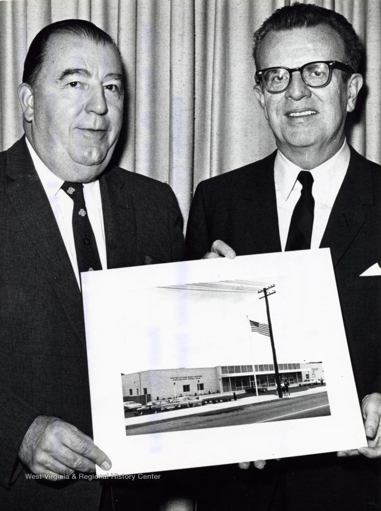 - 'The new Wheeling Post Office. The Office, largest in terms of space in West Virginia, will be dedicated Saturday (Oct. 1) at 2 P.M., and both the Postmaster General (right) and the Senator (left) will participate in colorful ceremonies which are open to the public.'