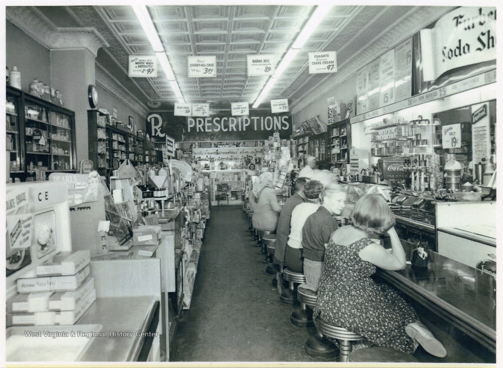 - A long view of the interior of Furbee's Rexall Drug Store on West Main Street, Bridgeport, W. Va.