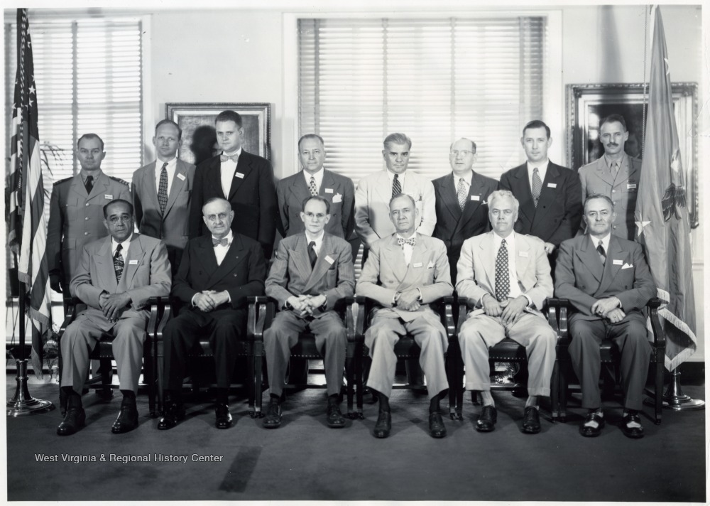 - 'Escorts: Commander John P. Floyd, USNR, Lt. Colonel H. L. Conner, USA; Sitting, Left to Right: Walter Aiken, H. R. Baukhage, Meyer Bernstein, Tams Bixby, Jr., Dr. H. C. Byrd, Harry De Butts; Standing, Left to Right: Commander John P. Floyd, R. MacGruder Dobie, Robert Estabrook, E. J. Forio, Kent Hunter, Julius Klein, James Lucas, Lt. Col. H. L. Conner'