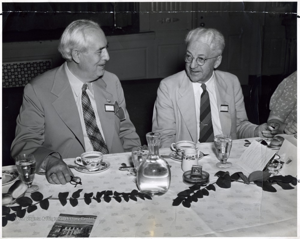 - A photograph of Lorren Johnson (left) and J. W. Wooddell (right) seated at a dinner table.