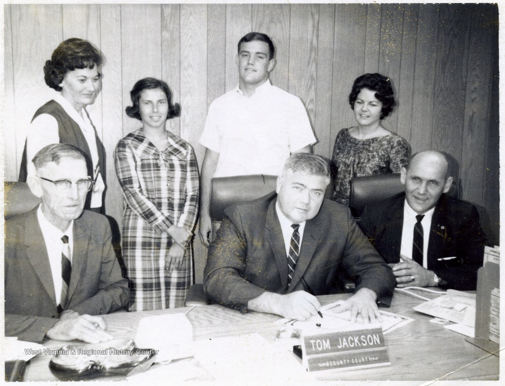 - A photograph of Tom Jackson of the County Court (seated, center), surrounded by Robert Nestor (seated, right) and (standing, left to right): Mrs. Jean Emch, Robin Core, and Harold "Chip" Bennett among others.