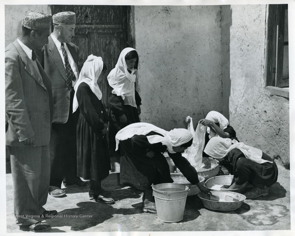 - 'Left to right Mr. Samimi of the Afghan Rural Development commission and Mr. Robert M. Snyder Director USOM/Afghanistan watch girls in the village school in the Logar Valley. The girls are learning proper methods of cleanliness.'