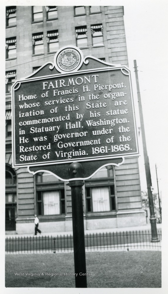 - "Fairmont--Home of Francis H. Pierpont, whose services in the organization of this State are commissioned by his statue in Statuary Hall, Washington. He was governor under the Restored Government of the State of Virginia, 1861-1868."
