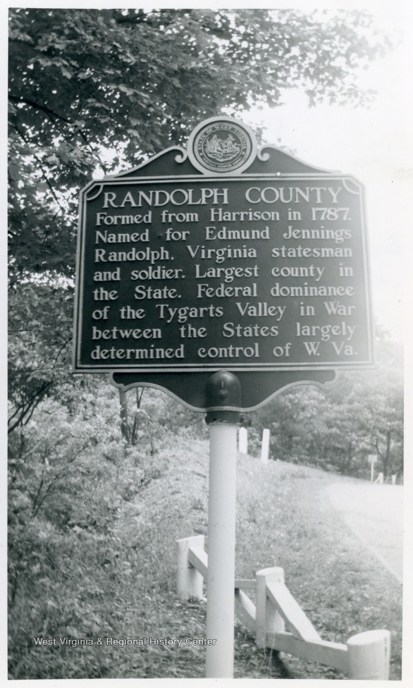 - "Randolph County--Formed from Harrison in 1787. Named for Edmund Jennings Randolph. Virginia statesman and soldier. Largest county in the State. Federal dominance of the Tygarts Valley in War between the States largely determined control of W. Va."