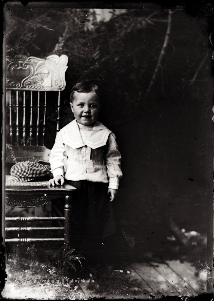 - A portrait of smiling boy leaning against a chair taken indoors in Helvetia, W. Va.