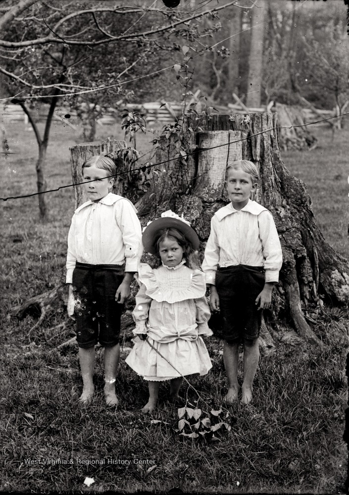 - A portrait of two boys and a girl taken outdoor in front of a tree stump, Helvetia, W. Va.