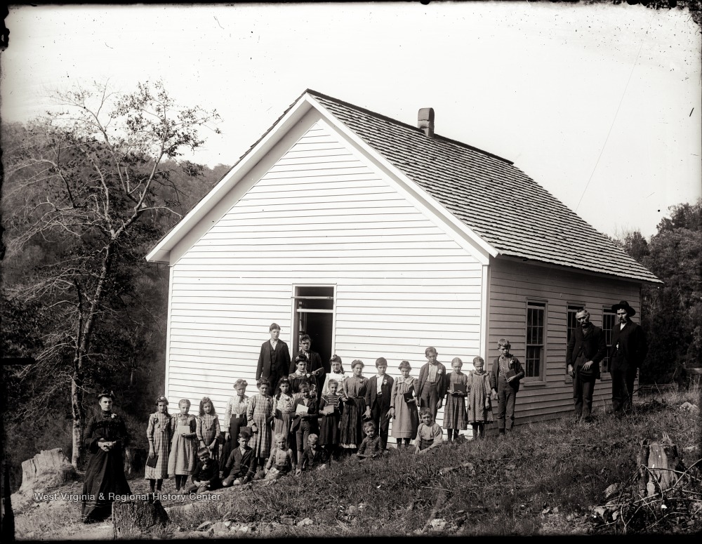- A portrait of school children and teachers taken just outside of the school building in the Helvetia, W. Va area.