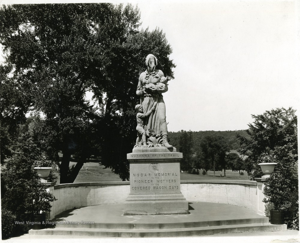 - Statue of Madonna of the Trail located in Wheeling on U.S Rt. 40. A Daughter's of the American Revolution statue. p. 114. 'N.S.D.A.R Memorial To The Pioneer Mothers Of The Covered Wagon Days.'