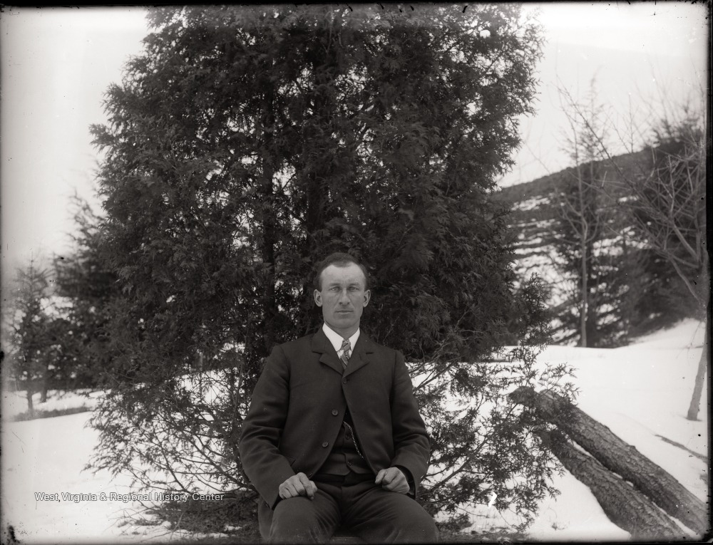 - A portrait of man seated in snow covered outdoors, Helvetia, W. Va.