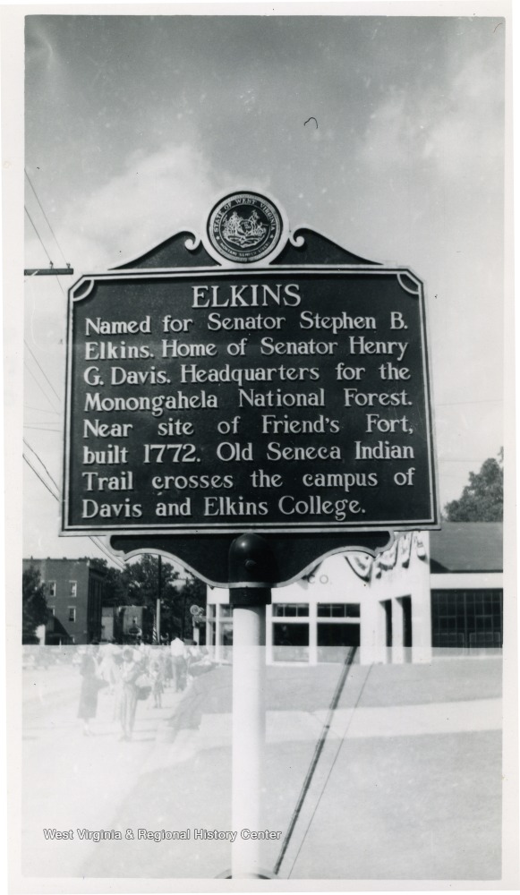 - 'Named for Senator Stephen B. Elkins. Home of Senator Henry G. Davis. Headquarters for the Monongahela National Forest. Near site of Friend's Fort, built in 1772. Old Seneca Indian Trail crosses the campus of Davis and Elkins College.'