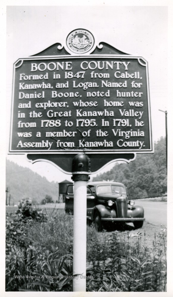 - Boone County Marker stands on the US Route 119. The marker reads: Boone County--Formed in 1847 from Cabell, Kanawha and Logan. Named for Daniel Boone noted hunter and explorer whose home was in the Great Kanawha Valley from 1788 to 1795. In 1791 he was a member of the Virginia Assembly from Kanawha county.