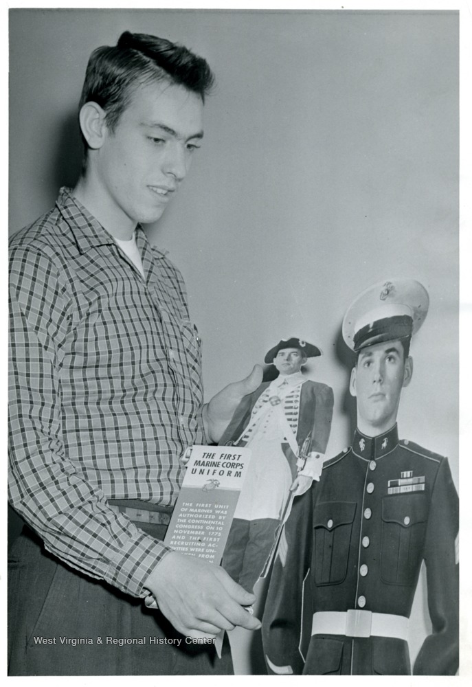 - An unidentified man holding an advertisement piece of Marine Corps.