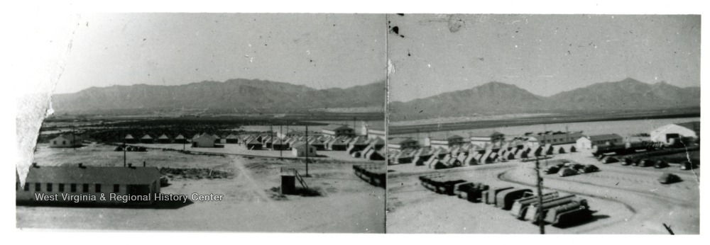 - A view of camp, the headquarters, tents and work vehicles are shown.