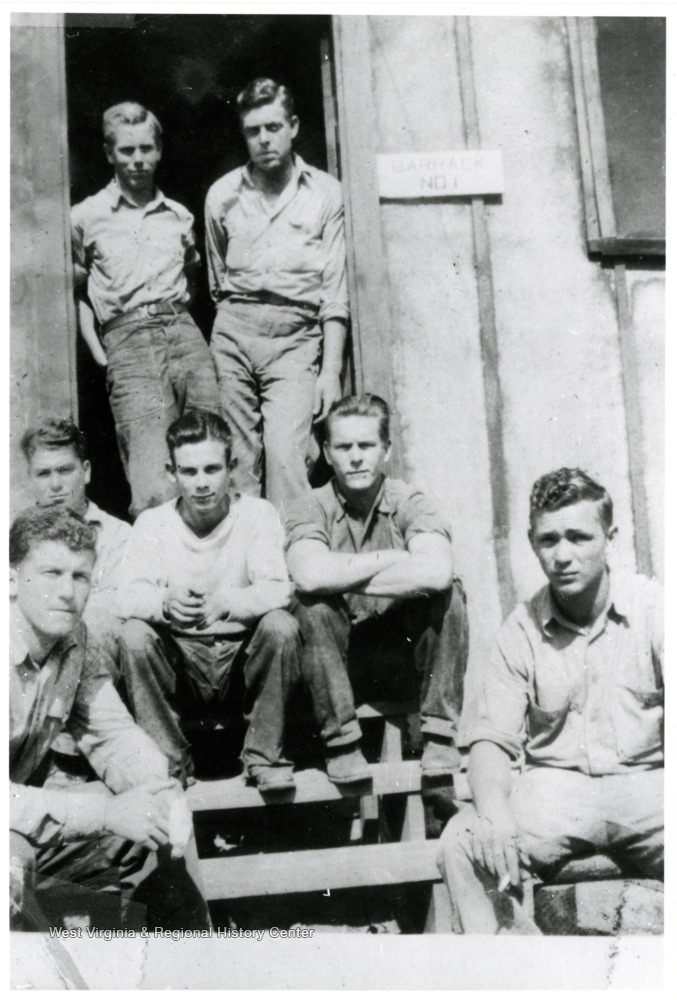 - Several camp friends pose around the entry way of the Barrack No.1.