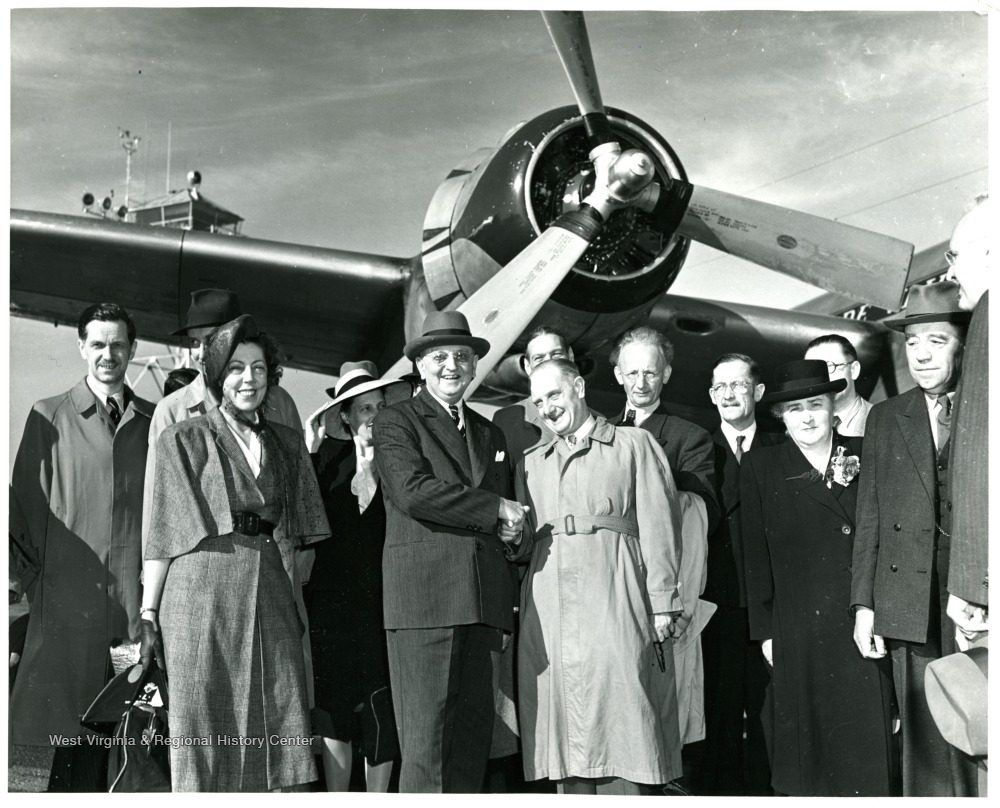 - "Dr. Frank N. D. Buchman welcomes the first European arrivals to the World Assembly for Moral Re-Armament at Los Angeles Airport. Left to right: Dr. Erwin Stein, Minister of Education for Hesse, Germany; Countess Carlo Lovera di Castiglione, Rome; Dr. Frank N. D. Buchman; Count Carlo Lovera di Castiglione, Rome; Mr. Robert Daum, Lord Mayor of Wuppertal, a Ruhr industrial city. Forty years Socialist Trade Union Leader; Dr. Katzenberger, Chief of the Press Bureau of Minister President of North Rhine-Westphalia (Ruhr), Mrs. Knud Kristensen, Leader of Farmers' Party of Denmark, Prime Minister from 1946-1947; Mr. George Eastman, President, Security Materials Company, Past President Los Angeles Chamber of Commerce." The World Assembly for Moral Re-Armament met in California June 2-3, 1948