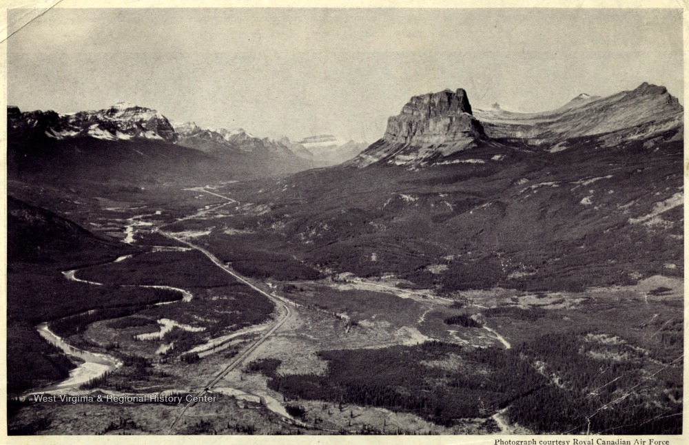 - "Looking West down Bow Valley, with Mount Temple on the left and Castle Mountain on the right, the Canadian Pacific Railway can be seen threading its way through the valley to the Pacific.'
