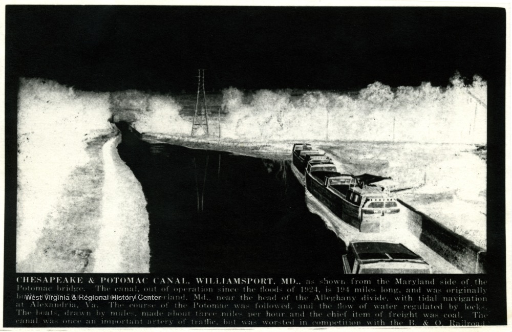 - 'The Canal as shown from the Maryland side of the Potomac bridge. The canal out of operation since the floods of 1924 is 194 miles long and was originally build 1828-50 to connect Cumberland, Md.. near the head of the Alleghany divide with tidal navigation at Alexander, Va. The course of the Potomac was followed and the flow of water was regulated by locals. The boat drawn by mules made about three miles per hour and the chief item of freight was coal. The canal was once an important artery of traffic but was worsted in competition with the B. & O. Railroad.'