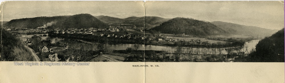 - Postcard photograph of a wide angle view of Marlinton and the Greenbrier River flowing through the town.