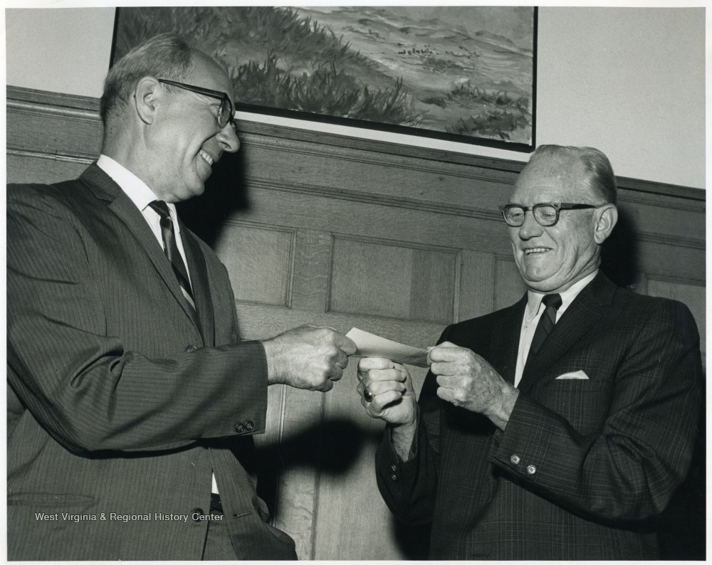 - 'Lloyd M. Jones(left) presenting check to Director of Athletics Robert N. Brown(right) for refund of sales tax from State Tax Commissioner for tax(sales)inadvertently paid to the State of W. Va. on room and meal for athletes in dormitories paid from the Athletic Fund.'