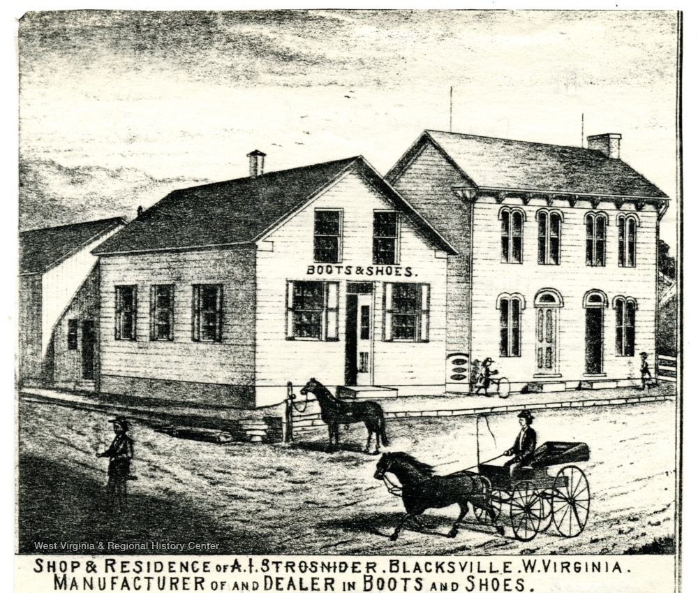- Shop and Residence of A. I Strosnider,manufacture and dealer of Boots and Shoes, Blacksville, W. Va. The illustration is from Coldvell's Illustrated Centennial Atlas of Greene County, 1876.