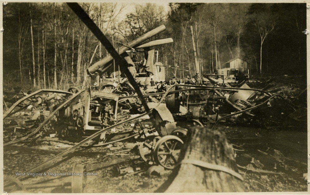 - 'The ruins of the Montes, W. Va., Giddings & Lewis bandmill which burned on (no date written) D. D. Brown came to Elkins on the Cumberland train the night this mill burned, and they phoned in from Montes the mill was burning. Of course, we were unable to get out of there until the morning train about 9:00. M. M. and I were greeted with this ruin which was not an encouraging sight. signed; D. D. Brown'