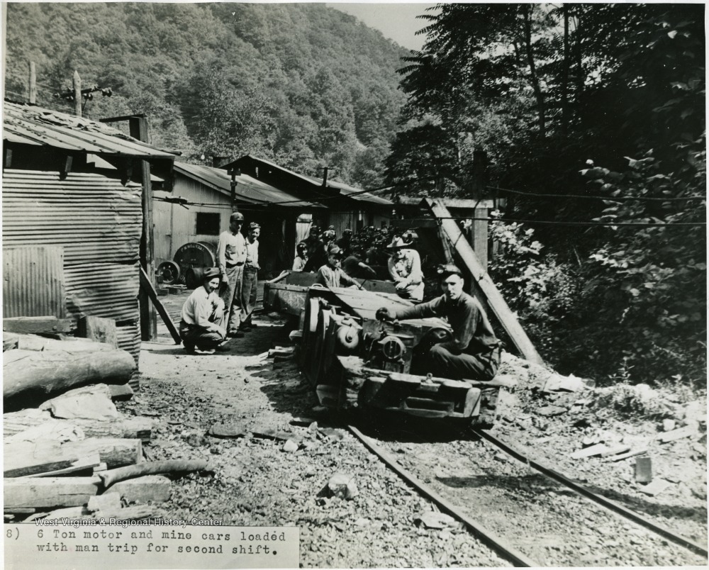 - "Six ton motor and mine cars loaded with man trip for second shift."