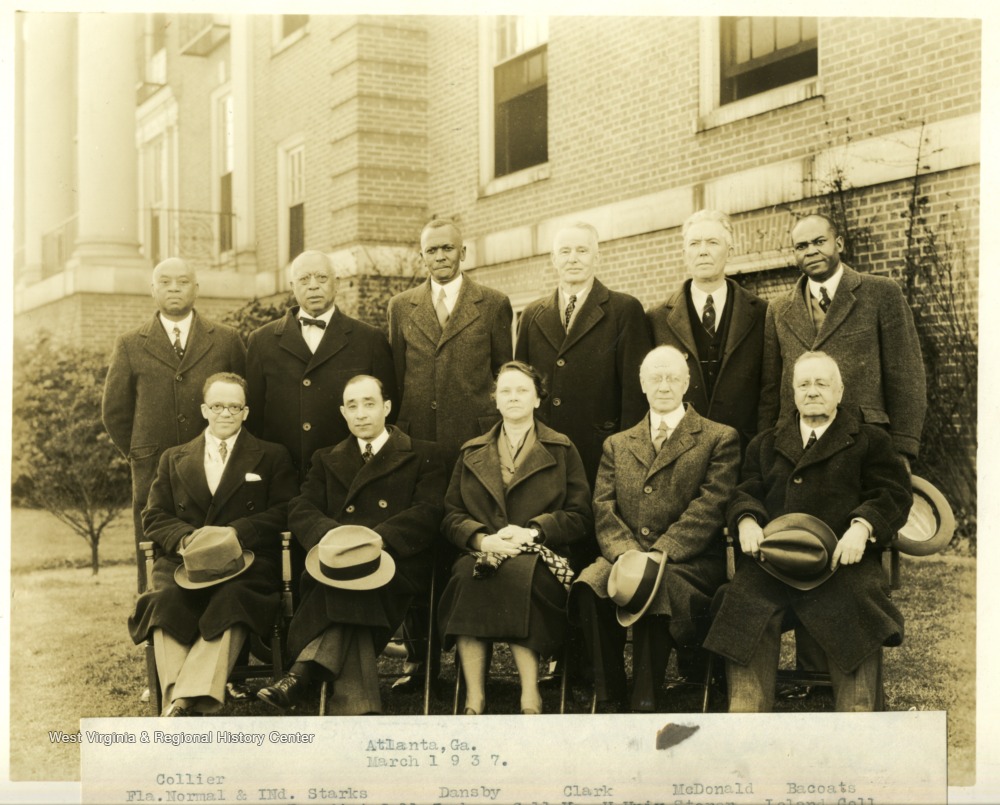 - A conference photo in Atlanta, Georgia. Back Row: Collier (Fla. Normal & Ind. Institute), Starks (Benedict Coll.), Dansby (Jackson Coll.), Clark (Va. U.), McDonald (Univ. Storer), Bacoats (Leland Coll.). Front Row: Daniel (Shaw U.), Nelson (Dillard U.), Read (Atlanta Univ.), Dr Frank W. Padelford, Dr. Frank A. Smith.