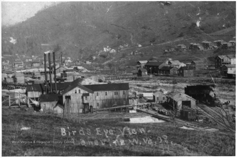 - Laneville, with the Dry Fork Company mill in the foreground. Note the footbridge across Red Creek (at center of picture), connecting the mill with the town.