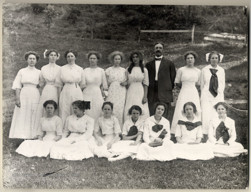 - Teacher E. Chase Bare is standing with female Allegheny Collegiate Institute students. Dorothy Gish is second from left from Mr. Bare.