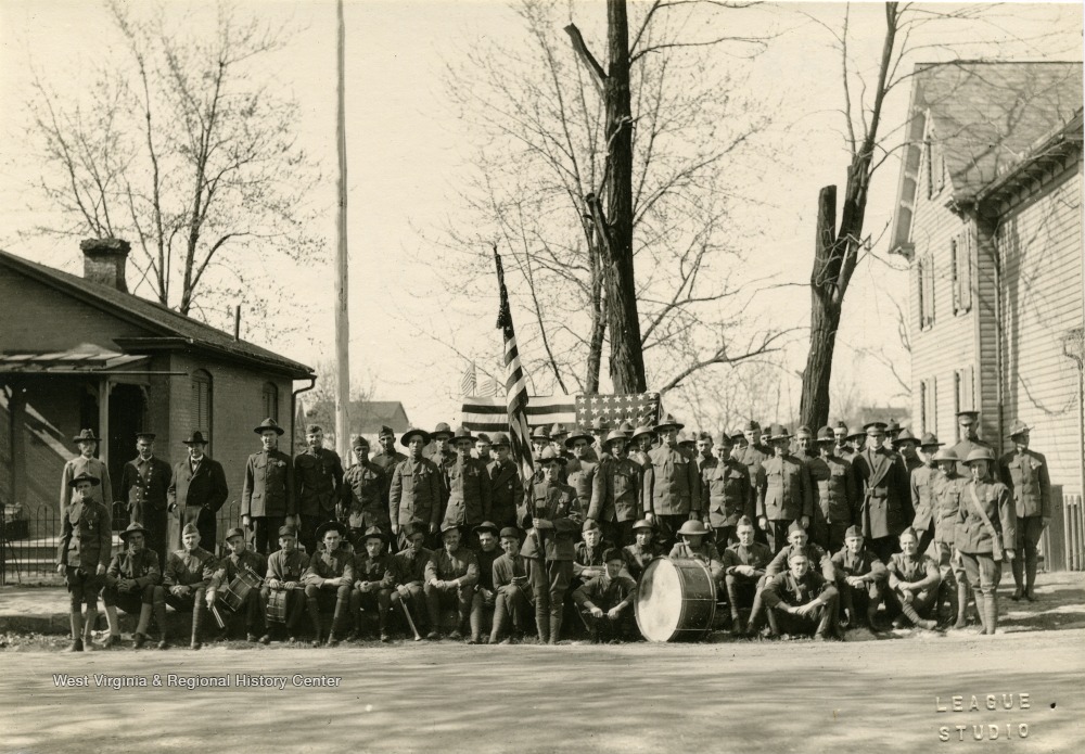 - Photograph of possibly an Army unit with flags, drums and some men wearing World War I doughboy helmets.