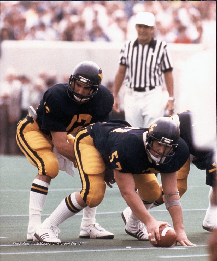 - West Virginia University Mountaineer Quarterback Oliver Luck lined up behind center during a game.