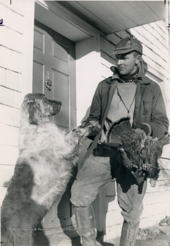 - Author, hunter and artist, George Bird Evans holds his kill and the paw of his English Setter.