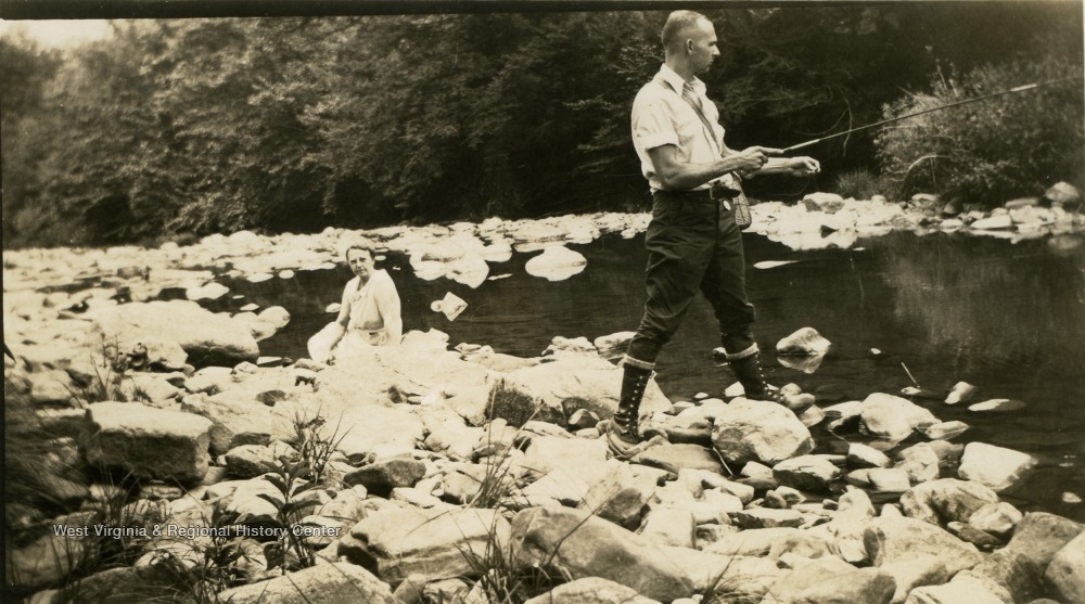 - George Bird Evans fly fishing from a rocky bank while an unidentified woman watches.