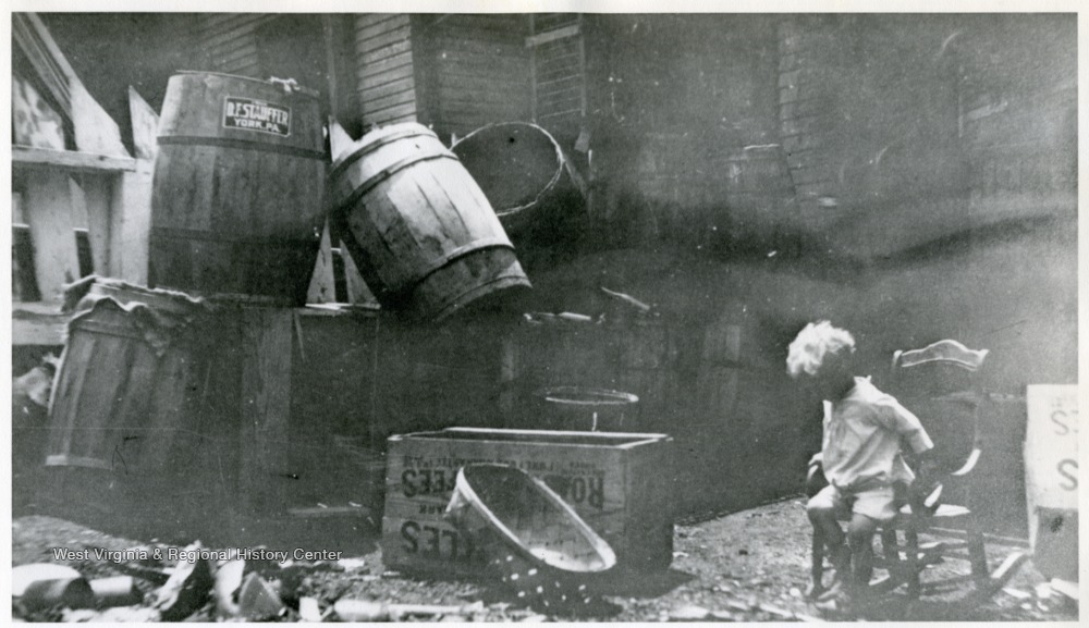 - Back yard of house on Sturgiss Avenue with unidentified child in rocker and large pile of barrels.