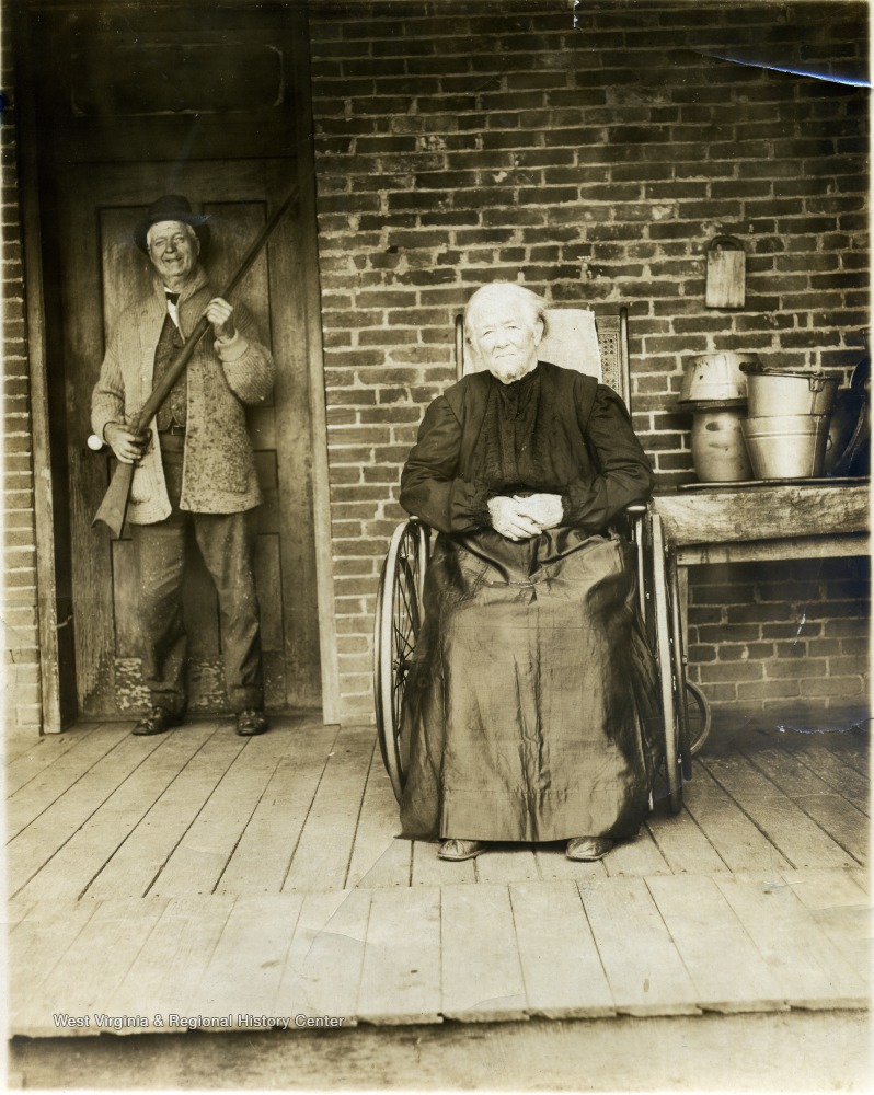 - Albert Price holding an old muzzle loading musket and his sister (in-law?) is seated in a wheelchair.