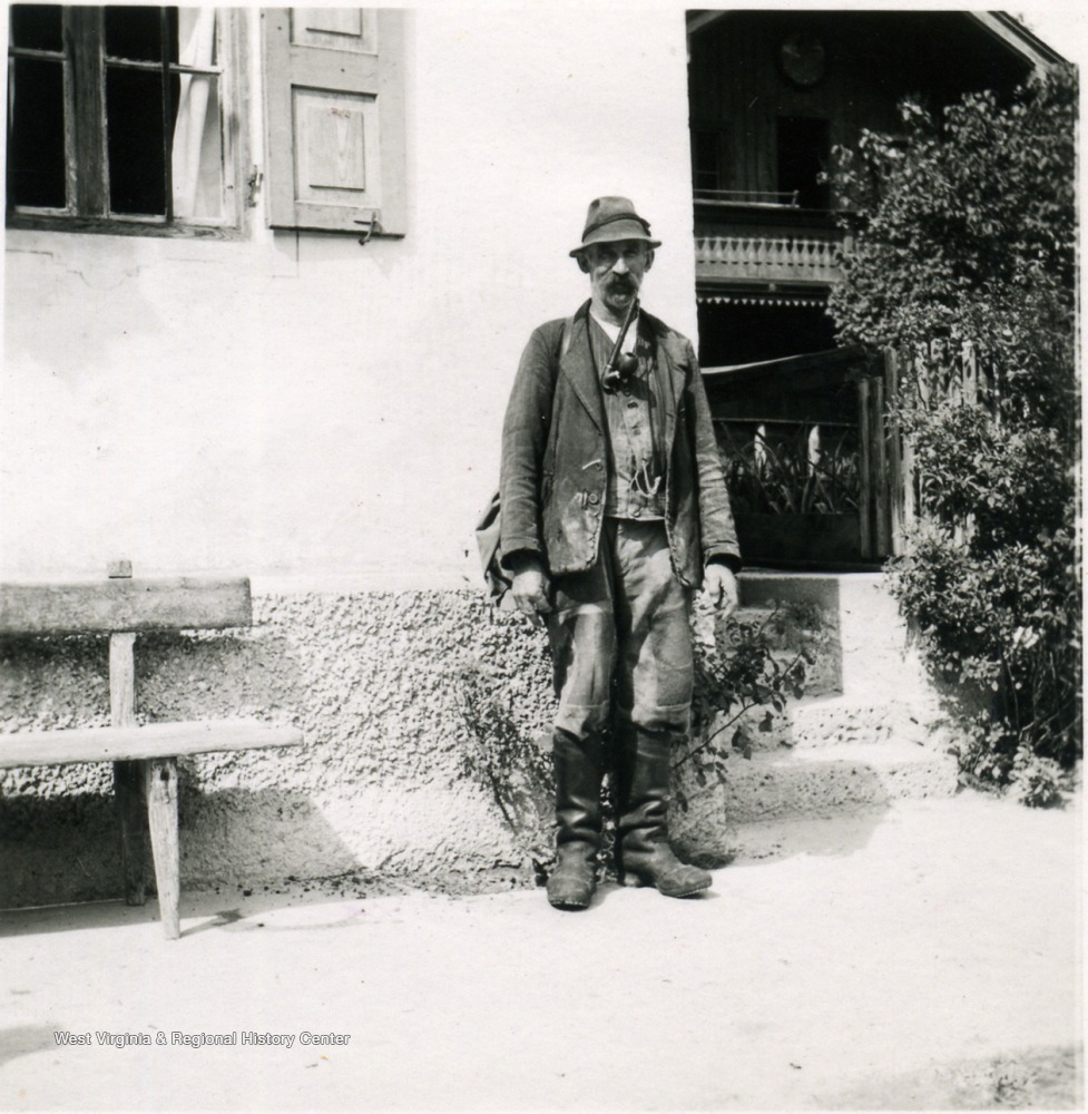 - Unidentified man dressed in laborer's clothes, including sturdy boots. This photograph was taken approximately three months after Germany surrendered. Note the unusual pipe the man has in his mouth.