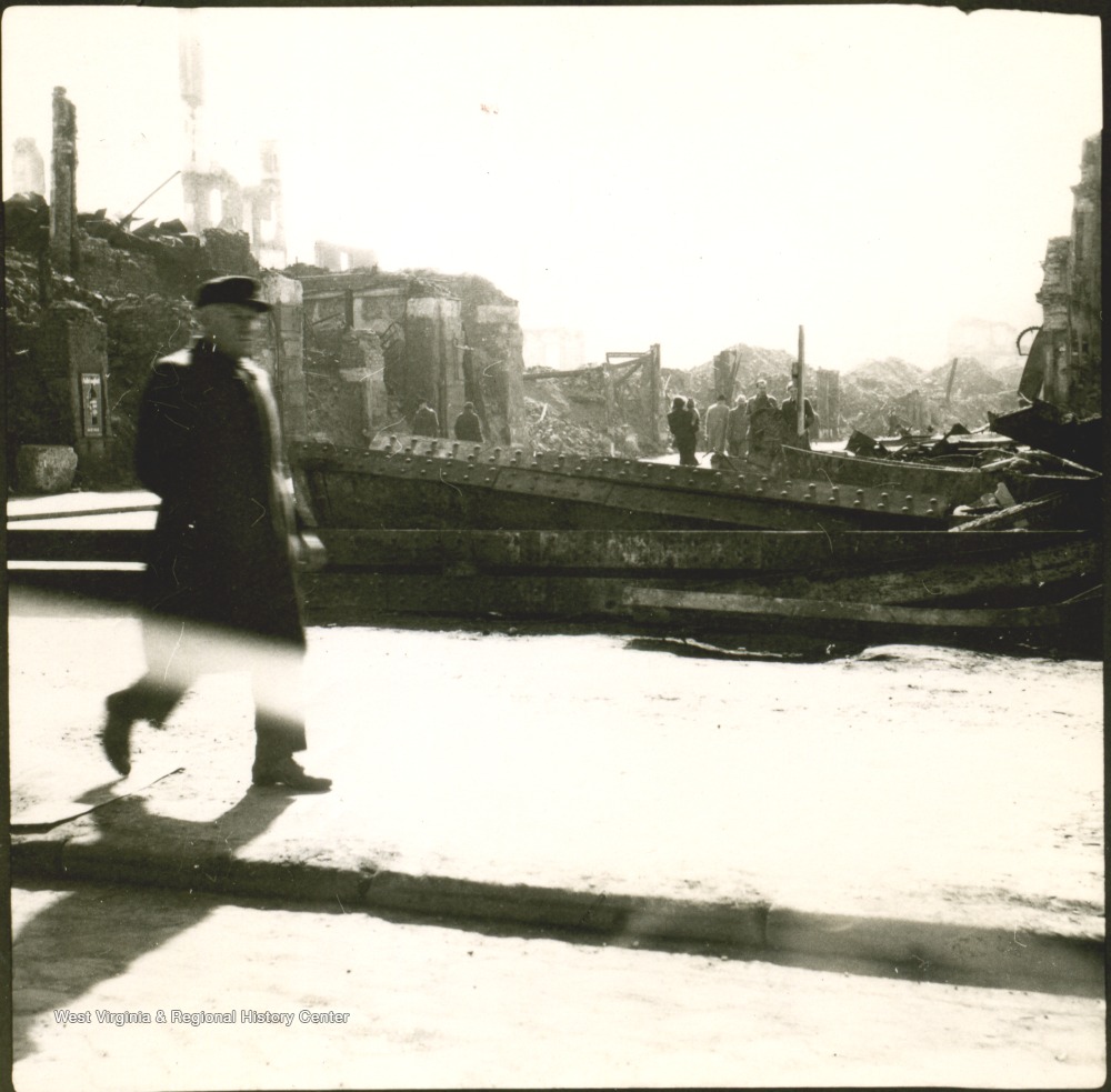 - Unidentified man walking passed ruins of buildings destroyed during the war.