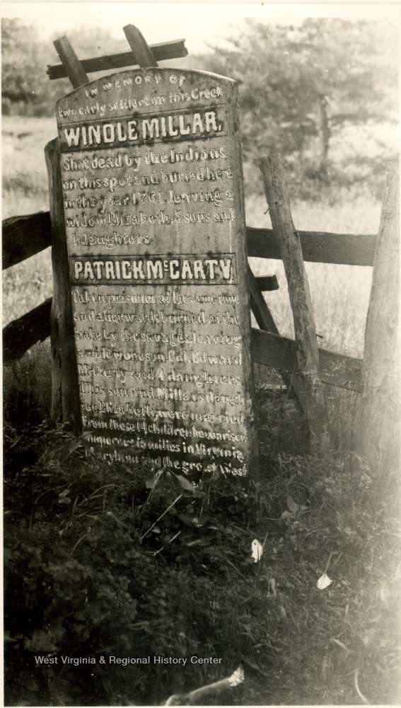 - Memorial for two early settlers, Windle Millar and Patrick McCarty who were killed by Indians in 1761.