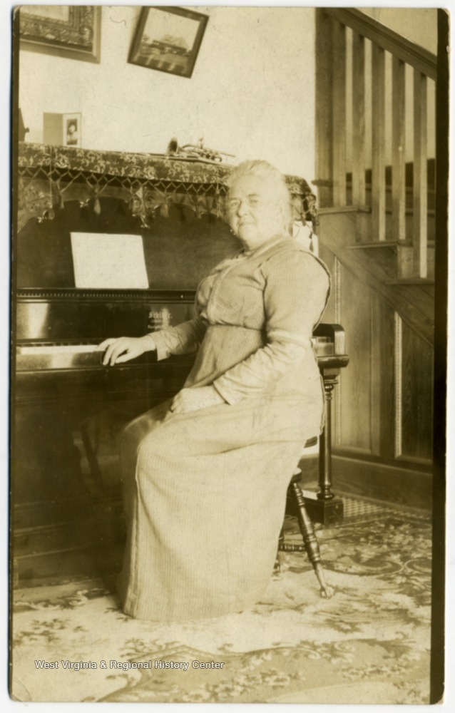 - Post card print of May Haldeman sitting at a piano. Note on the back written by May and describes in the photograph in detail.