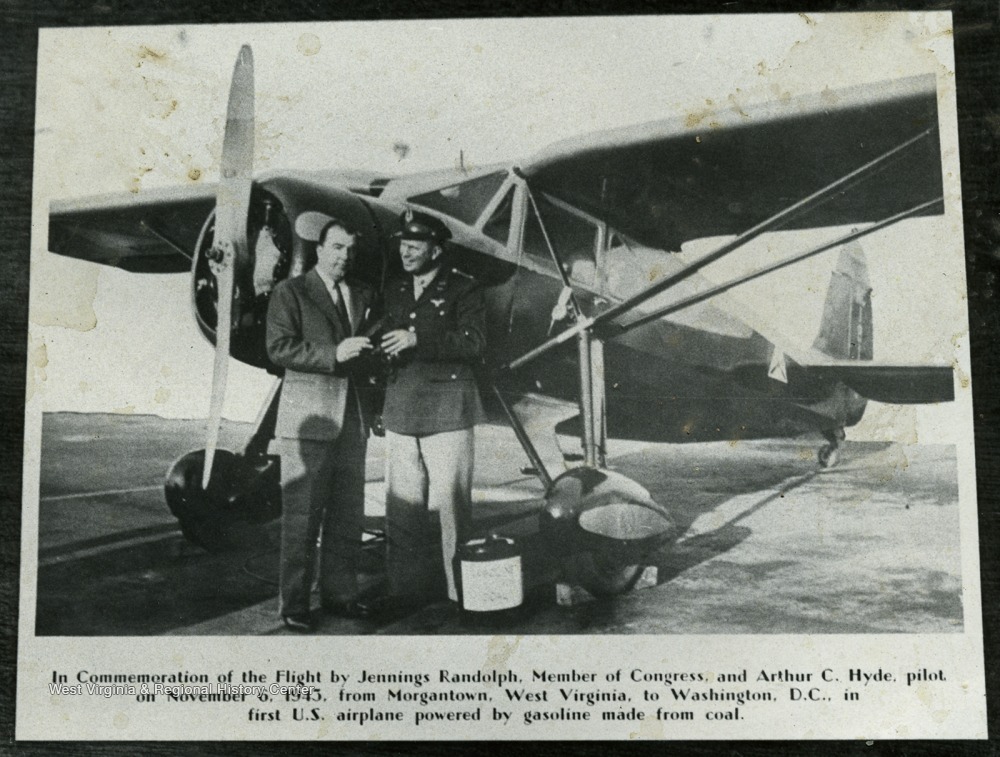 - In commemoration of the flight by Jennings Randolph, member of Congress and Arthur C. Hyde, pilot, on November 6, 1943, from Morgantown, West Virginia to Washington D. C., in first U. S. airplane powered by gasoline made from coal.