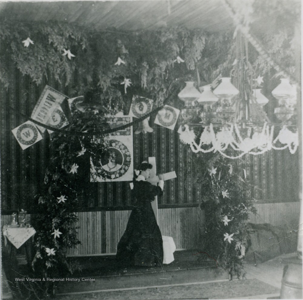 - A woman positions a cross on the alter, which is decorated in evergreens and ornaments for Christmas. Note the kerosene lamp chandelier to the right. The church is located in the Clay District of Monongalia County.