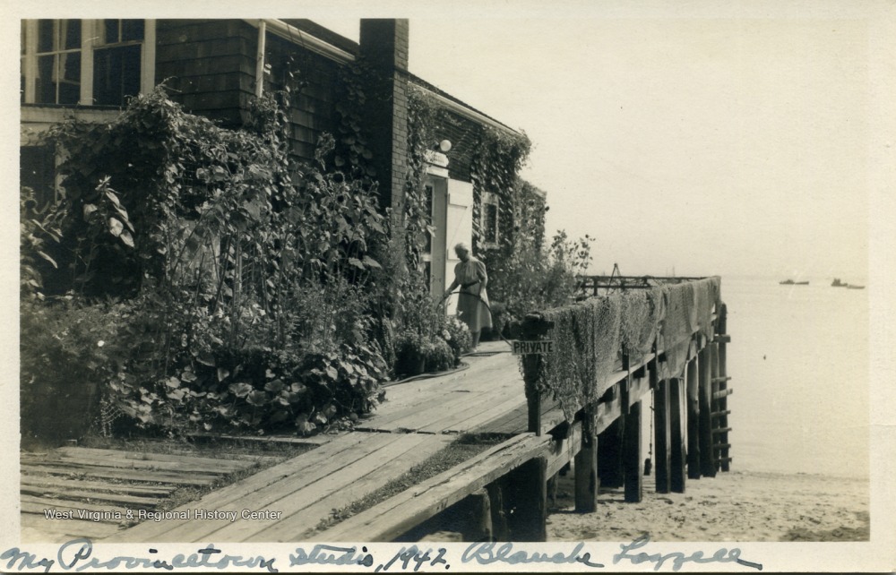 - Post card photograph of artist Blanche Lazzell watering her flowers in front of her studio which is on a pier in Provincetown, Massachusetts located on Cape Cod.