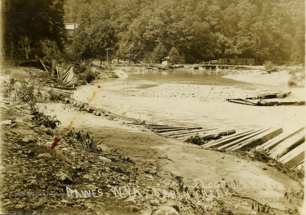 - Postcard photograph of the flood damage along Cabin Creek including the railroad tracks in the background. Information on the back: "Hinton Daily News Collection - John Faulkner Collection From Jim Pettrey to Stephen Trail 1997".