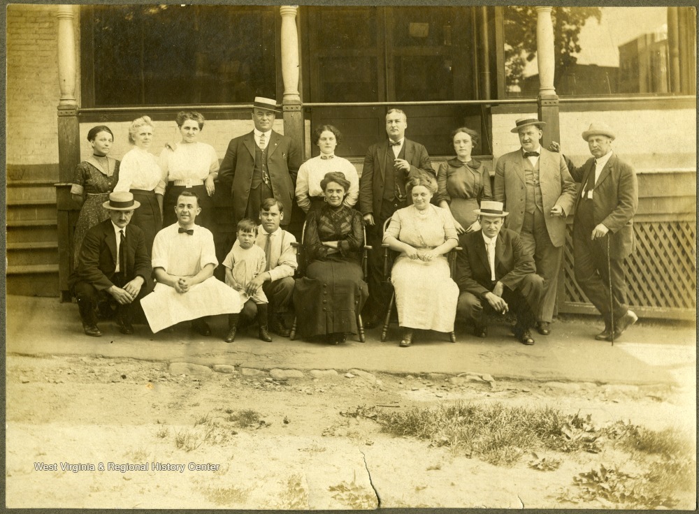 - Inscribed on back: "Believed to be early hotel (on the corner of 5th Avenue and Front = conjecture) in Hinton. Possibly Rudisell 2nd from L, standing [All other persons are unidentified]. Hotel staff is posed in front of the entrance steps,leading to a wide wrap-around porch with double door entrance.Tall multi-story masonry bldgs appear in R beyond porch. Purchased by Stephen Trail in Hinton West Virginia."