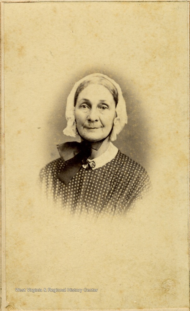 - An older woman in a bonnet and polka dot dress. There is a revenue stamp on the back of the photograph indicating a tax was paid to support the Federal War effort during the Civil war.