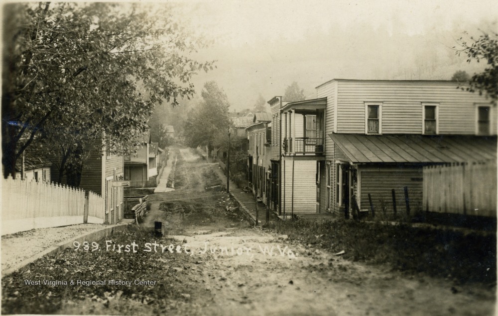 - Postcard photograph of unpaved First Street in the town of Junior along the Tygart River.