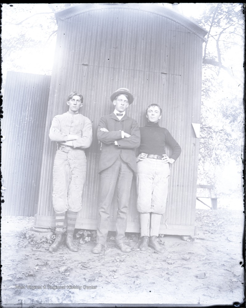 - Three unidentified young men pose by an outbuilding. Two are wearing well -padded uniforms, possibly for football.