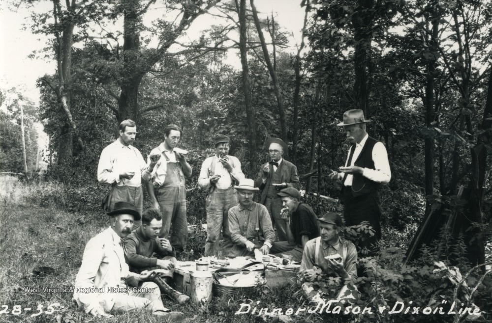 - Expedition crew marking north-south boundary of West Virginia and Maryland take a break to eat dinner on the Mason Dixon line. (Standing up on right) Samuel Garnett, U.S. geological surveyer.