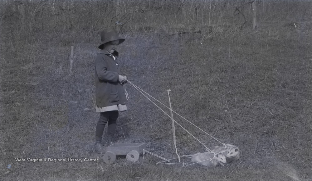 - Little Girl and Pet Possums Pulling Cart; Monongalia County, W. Va.