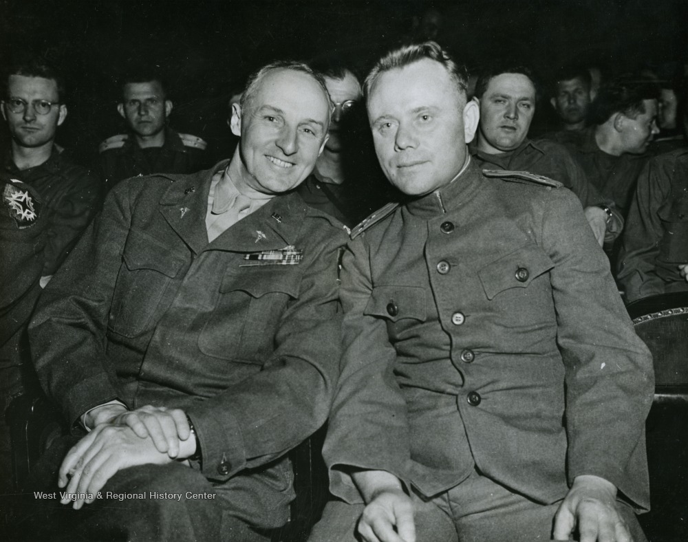 - Information on back of photo reads: "Colonel H.A. Forlong (left) of Pontiac, Michigan, Surgeon of the 18th Corps, Ninth U.S. Army, sits beside a Russian Army officer at a stage show given in Lippstadt, Germany, May 20, 1945, by liberated Russian soldiers and former slave workers. Lippstadt is 70 miles northwest of the Rhine River city of Duisburg.